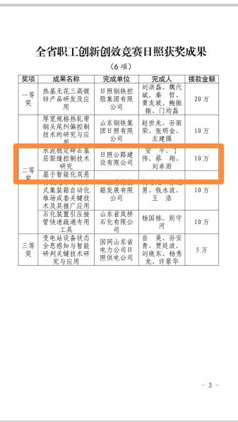 近日,從市總工會(huì)獲悉,集團(tuán)建設(shè)公司創(chuàng)新團(tuán)隊(duì)成果《水泥穩(wěn)定碎石基層裂縫控制技術(shù)研究與應(yīng)用》榮獲2021年度山東省職工創(chuàng)新創(chuàng)效競賽二等獎(jiǎng),并獲資助資金10萬元。