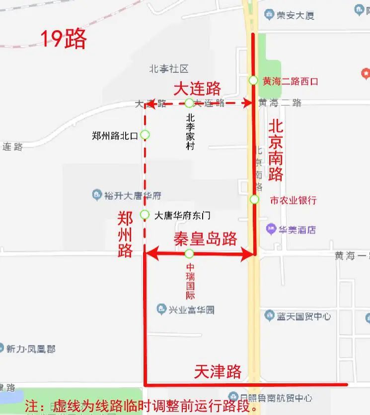 原運行鄭州路(秦皇島路-大連路)、大連路(鄭州路-北京南路)路段停止運行,臨時調(diào)整為秦皇島路(鄭州路-北京南路)、北京南路(秦皇島路-大連路)路段運行。臨時撤銷“大唐華府東門、鄭州路北口、北李家村”站,臨時增設(shè)“中瑞國際、市農(nóng)業(yè)銀行”站。