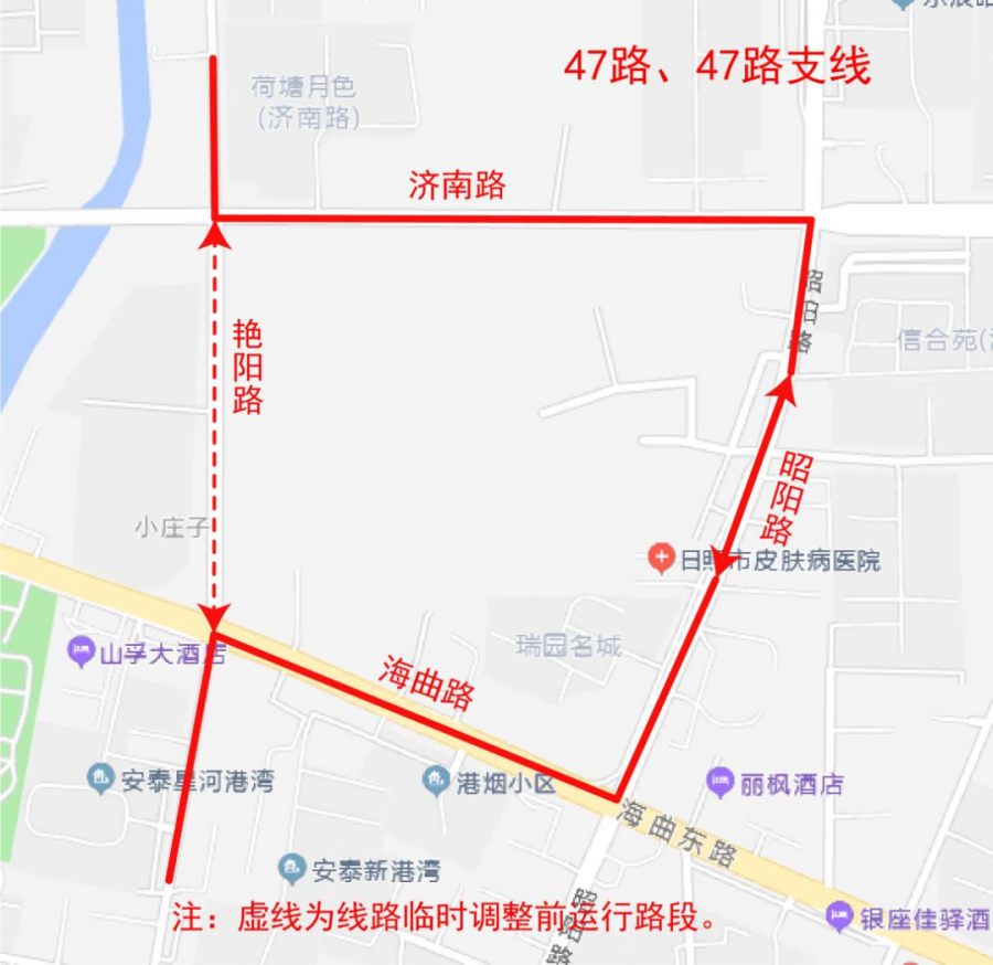 因艷陽路(濟(jì)南路-海曲路)路段封閉施工,致使運(yùn)行該路段的47路、47路支線無法正常通行。為最大限度減少道路施工給乘客出行帶來的不便,定于9月13日起對(duì)以上線路部分運(yùn)行路段進(jìn)行臨時(shí)調(diào)整,待具備通車條件后再恢復(fù)原線路運(yùn)行。具體如下:原運(yùn)行艷陽路(濟(jì)南路-海曲路)路段停止運(yùn)行,臨時(shí)調(diào)整為濟(jì)南路(艷陽路-昭陽路)、昭陽路(濟(jì)南路-海曲路)、海曲路(昭陽路-艷陽路)路段運(yùn)行。臨時(shí)撤銷“荷塘月色(路西)、艷陽路海曲路(路東)”站,臨時(shí)增設(shè)“許家樓、東港煙草、皮膚病醫(yī)院、海曲路昭陽路(路北)、日照愛爾眼科醫(yī)院(路南)”站。原“荷塘月色(路西)”站的乘客可在“許家樓(路南)”站乘車,原“艷陽路海曲路(路東)”站的乘客可在“日照愛爾眼科醫(yī)院(路南)”站乘車。線路除臨時(shí)調(diào)整路段以外,其他運(yùn)行路段不變。線路首末班時(shí)間和發(fā)車間隔不變,由此給您帶來的不便敬請(qǐng)諒解。