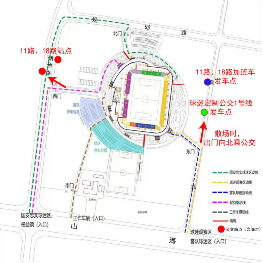 2.中超球迷定制公交車輛停放規(guī)劃路(東門—規(guī)劃路)路段,在日照國際足球中心東門北側(cè)設(shè)置中超球迷定制公交臨時站。賽事結(jié)束后,線路在“中超球迷定制公交臨時站”站發(fā)車。為使球迷能夠及時返回,線路??砍裏熍_路、山海路以外的沿途公交站點(煙臺路的乘客可乘坐11路、18路)。