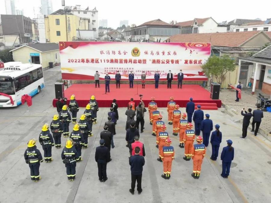 11月9日,日照市東港區(qū)消防救援大隊、日照市城鄉(xiāng)公交一體化運營有限公司在日照路公交首末站舉行東港區(qū)2022年“119”消防宣傳月啟動暨“消防公交專線”發(fā)車儀式。市消防救援支隊副支隊長辛本順、東港區(qū)政府副區(qū)長闞微微、市交通運輸局道路運輸服務中心主任李政、集團安全總監(jiān)張善愛、東港區(qū)消防救援大隊相關領導出席儀式。東港區(qū)有關職能部門分管負責人、消防救援人員、消防志愿者及城鄉(xiāng)一體化公司干部職工參加活動。