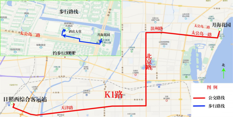 乘坐高鐵乘客可在日照西綜合客運站下車后,到公交換乘中心乘坐K1路到“月?;▓@”站下車(返程時,同站上車),站點西側(cè)為嵐橋錦江大酒店,從站點步行300米即可到達(dá)酒店大堂。