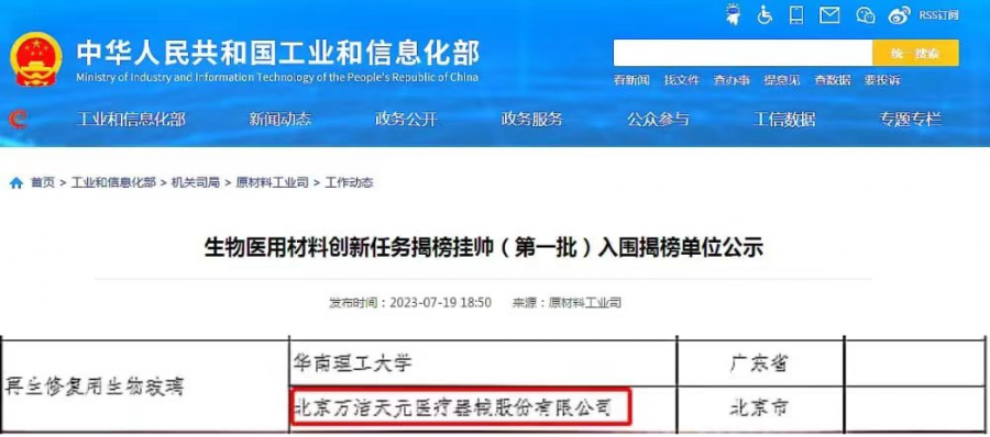 7月19日,由北京萬潔天元醫(yī)療器械股份有限公司牽頭,日照交通發(fā)展集團產(chǎn)業(yè)開發(fā)有限公司參與,中國科學院化學研究所科研攻關(guān)團隊和華魁科技泰州有限公司、首都醫(yī)科大學附屬北京友誼醫(yī)院骨科團隊共同研制的無機非金屬材料方向再生修復(fù)用生物玻璃項目入圍工信部和國家藥監(jiān)局生物醫(yī)用材料創(chuàng)新任務(wù)揭榜掛帥(第一批)揭榜單位,首批入圍該品類揭榜單位全國僅有兩家。