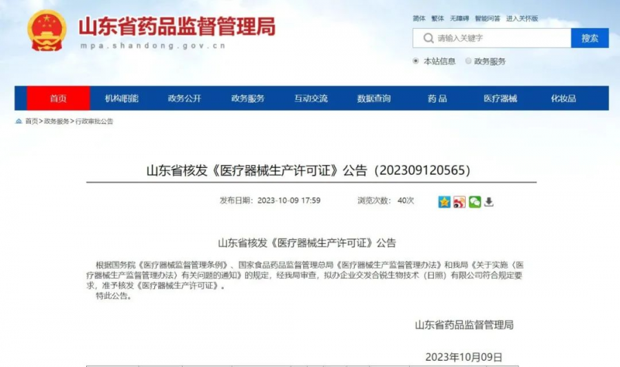 2023年10月9日,交發(fā)合銳生物技術(shù)(日照)有限公司獲得了由山東省藥品監(jiān)督管理局頒發(fā)的《醫(yī)療器械生產(chǎn)許可證》(許可證編號(hào):魯藥監(jiān)械生產(chǎn)許20230096號(hào))。