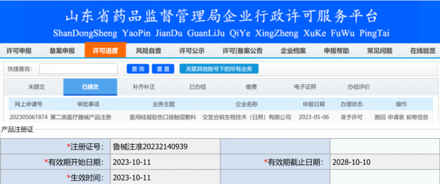 2023年10月11日,交發(fā)合銳生物技術(shù)(日照)有限公司順利取得第二款產(chǎn)品注冊(cè)證(醫(yī)用硅凝膠傷口接觸層敷料),注冊(cè)證編號(hào):魯械注準(zhǔn)20232140939。