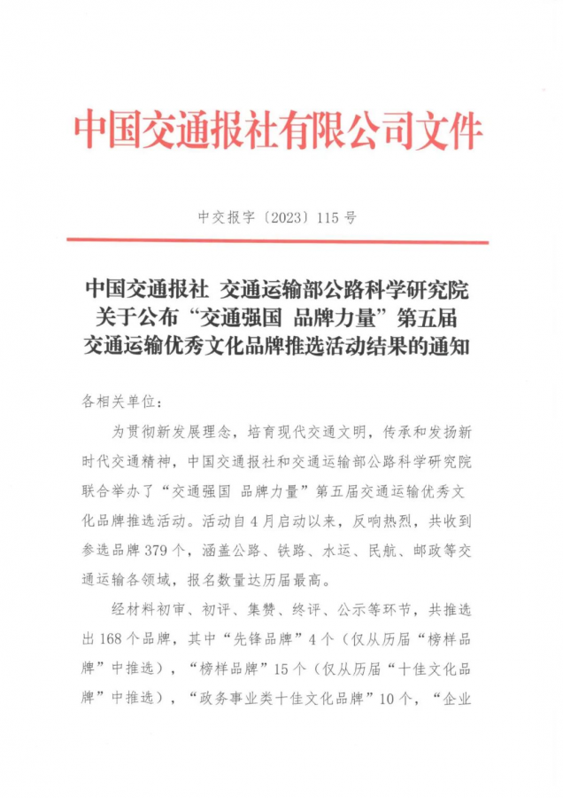 近日,由中國(guó)交通報(bào)社與交通運(yùn)輸部公路科學(xué)研究院共同主辦的“交通強(qiáng)國(guó) 品牌力量”第五屆交通運(yùn)輸優(yōu)秀文化品牌推選活動(dòng)獲獎(jiǎng)名單揭曉。集團(tuán)獲得“創(chuàng)新力文化品牌”榮譽(yù)稱(chēng)號(hào)。