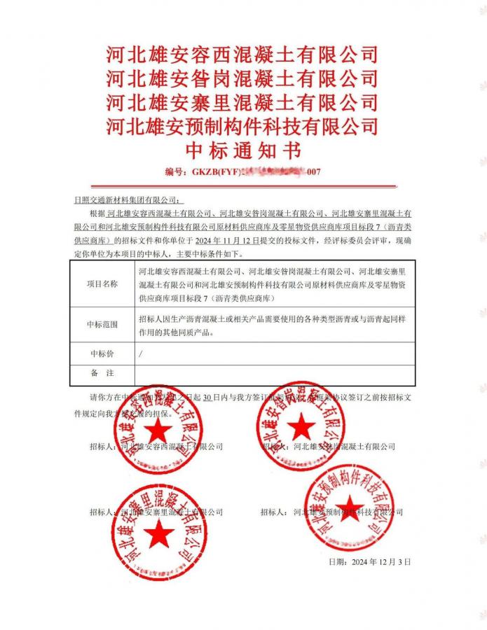 12月3日,集團(tuán)所屬的日照交通新材料集團(tuán)成功中標(biāo)河北雄安容西混凝土有限公司等4家公司原材料供應(yīng)商庫(kù)及零星物資供應(yīng)商庫(kù)項(xiàng)目。