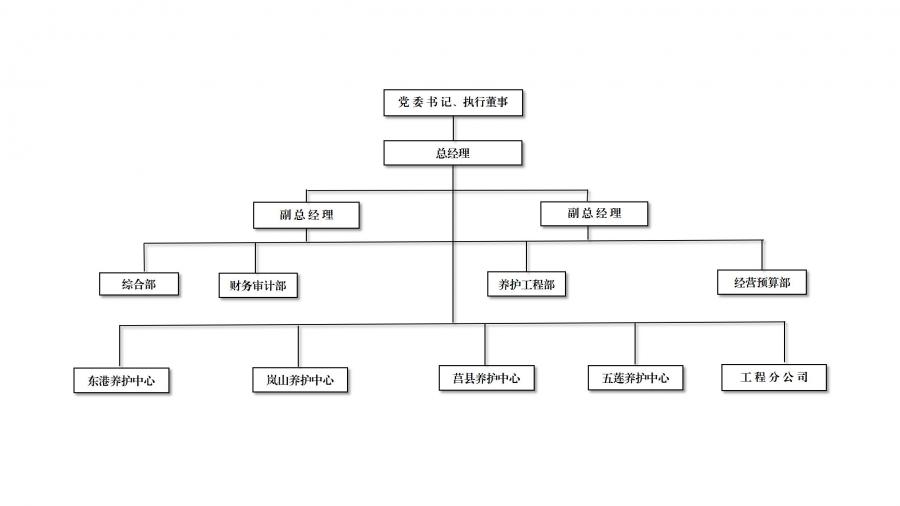設綜合部、財務審計部、養(yǎng)護工程部、經營預算部4個部室,東港、嵐山、莒縣和五蓮4個養(yǎng)護中心,1個工程分公司,