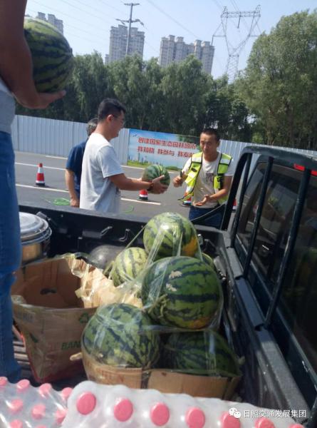 施工時(shí),路面溫度50攝氏度,汗水順著施工人員的臉頰直往下流,全身的衣服都被汗水浸濕,腳下的瀝青油已經(jīng)開始融化。為了防止施工人員中暑,藿香正氣水、綠豆湯等解暑物資源源不斷的的送至施工現(xiàn)場(chǎng),施工人員輪流休息就餐。