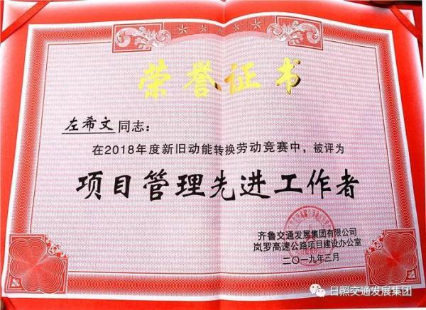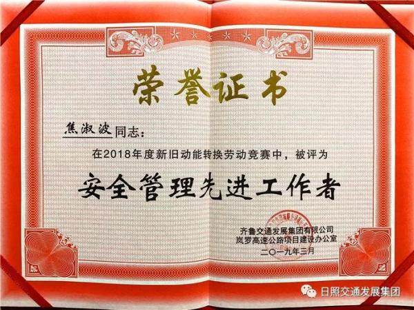 3月2日,在齊魯交通發(fā)展集團嵐羅高速項目2019年加快工程建設(shè)動員大會上,建設(shè)公司嵐羅高速一合同項目部被評為“2018年度優(yōu)秀施工單位”、“2018年決戰(zhàn)四季度先進單位”,在2018年度考核中勇奪第一,獲得獎勵金50萬元。魏玉峰同志榮獲“優(yōu)秀項目經(jīng)理”稱號,左希文、張數(shù)松榮獲“項目管理先進工作者”稱號,焦淑波榮獲“安全管理先進工作者”稱號,郭輝班組榮獲“優(yōu)秀施工班組”稱號。
