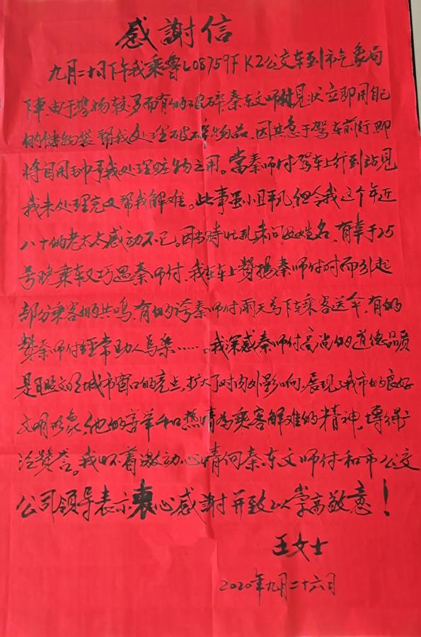 乘客王阿姨在乘坐K2路車時,由于包裝袋不結(jié)實,導致剛剛購買的雞蛋摔漏在車廂地板上,破碎的雞蛋弄臟了地板。駕駛員秦東文師傅發(fā)現(xiàn)后,便利用靠站的空隙,用自己平時用的毛巾幫忙把地板上的蛋液擦干凈,并拿來一個桶盛裝破碎的雞蛋等。王阿姨非常感動,回去之后寫了一封感謝信送到了公司辦公室,表達對秦師傅的感激之情。