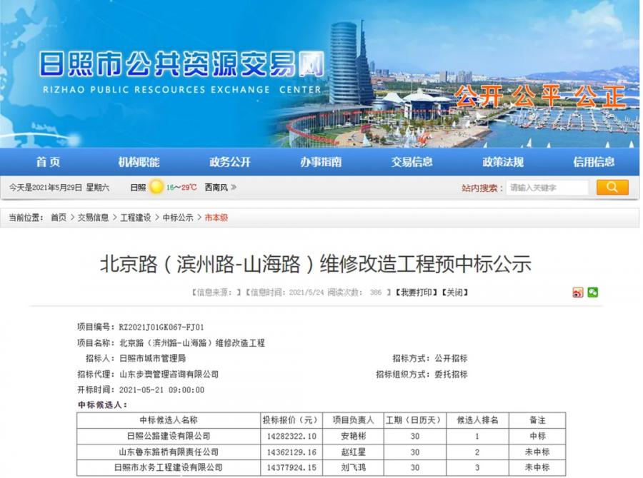 5月26日,集團(tuán)建設(shè)公司憑借豐富的招投標(biāo)經(jīng)驗(yàn)和雄厚的技術(shù)實(shí)力,經(jīng)過資格審查和投標(biāo)競(jìng)價(jià)等環(huán)節(jié),成功中標(biāo)北京路(濱州路-山海路)維修改造工程,中標(biāo)金額1428.23萬元。