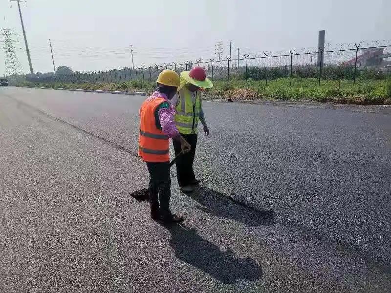 身著橘紅色工裝的一線員工們,正汗流浹背地進(jìn)行攤鋪施工。盛夏酷暑,瀝青路面溫度已高達(dá)60多攝氏度,從自卸車斗卸下的瀝青混合料更是高達(dá)一百五六十度以上,攤鋪機(jī)經(jīng)過(guò)之處彌漫起一陣青灰色的煙塵。就在“上烤下蒸”的模式下,一線員工滿頭汗水順著臉頰淌下,身上的汗堿在布滿油污與灰塵的工作服上干了一圈,又濕了一圈,生成了一幅“鹽堿地圖”。但他們一絲不茍按照規(guī)范施工,加班加點(diǎn)、搶趕工期,齊心協(xié)力抓好施工任務(wù)。
