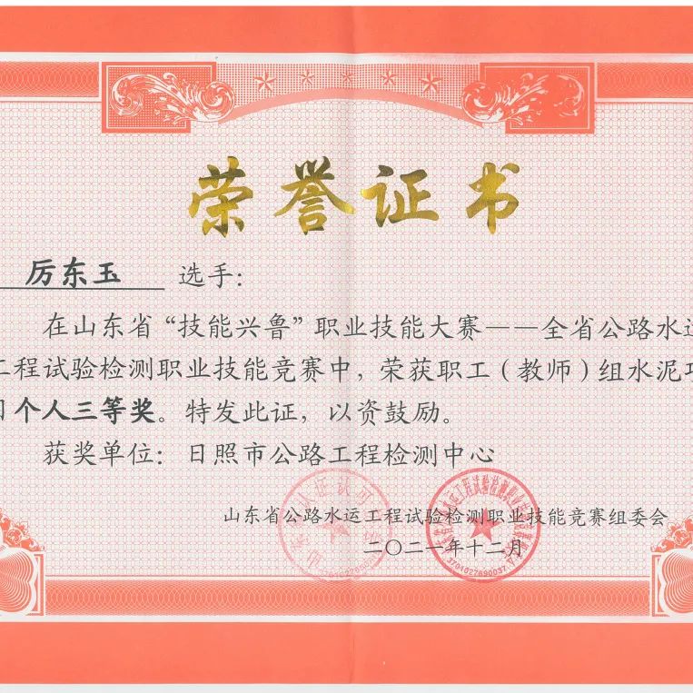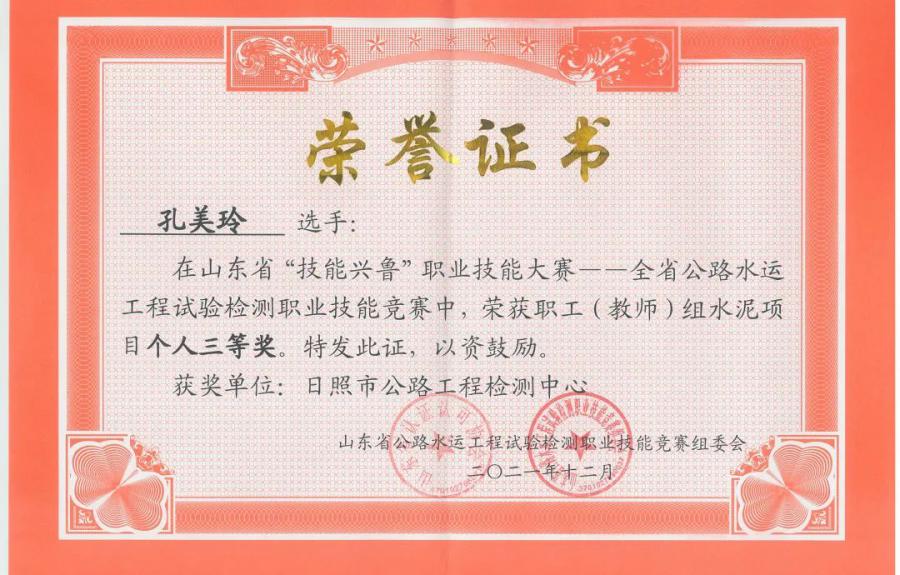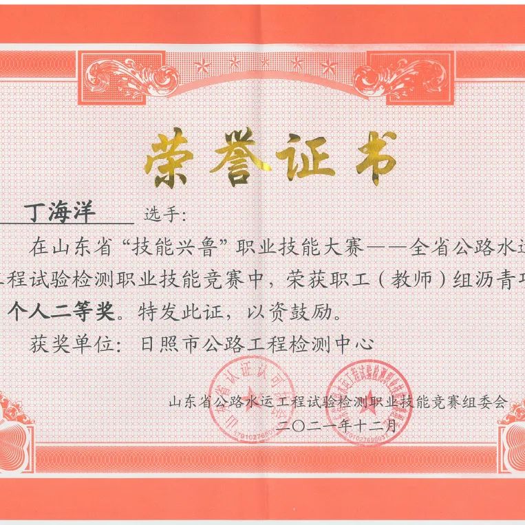 12月23日,由山東省人力資源和社會保障廳組織,山東省認證認可協(xié)會主辦,山東公路技師學院承辦的2021年山東省“技能興魯”職業(yè)技能大賽——山東省公路水運工程試驗檢測職業(yè)技能競賽傳來喜訊,集團建設(shè)公司丁海洋榮獲瀝青項目個人二等獎,厲東玉、孔美玲榮獲水泥項目個人三等獎,建設(shè)公司代表隊榮獲水泥、瀝青項目團體三等獎。