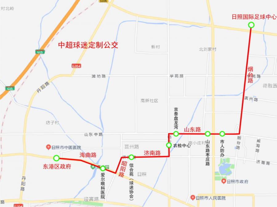 (二)運行路線:由東港區(qū)政府站始發(fā),沿途經(jīng)停日照愛爾眼科醫(yī)院、信合苑(球迷協(xié)會)、農(nóng)檢中心、京泰盤龍灣、山東路棗莊路、市人防辦至日照國際足球中心(外國語大學(xué)東),線路長度12.0公里。