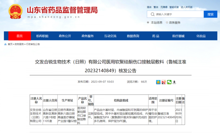 交發(fā)合銳生物獲批醫(yī)用軟聚硅酮傷口接觸層敷料注冊證