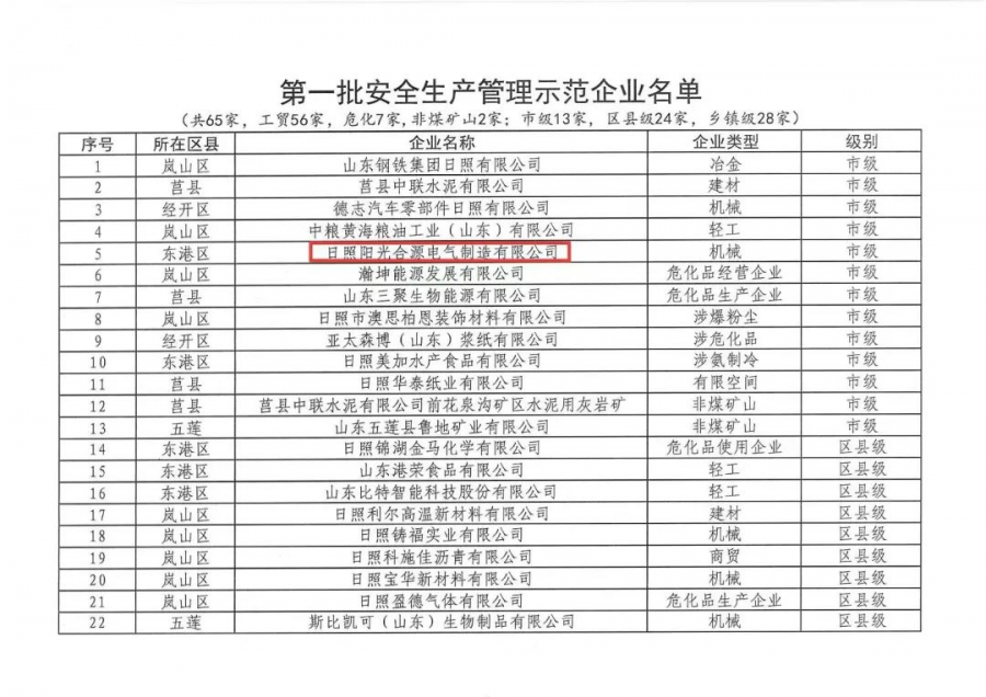 10月10日,集團(tuán)陽光合源電氣公司順利通過市應(yīng)急管理局安全考評驗(yàn)收,榮獲“市級安全生產(chǎn)管理示范企業(yè)”稱號,標(biāo)志著公司安全生產(chǎn)管理工作邁上新臺階。