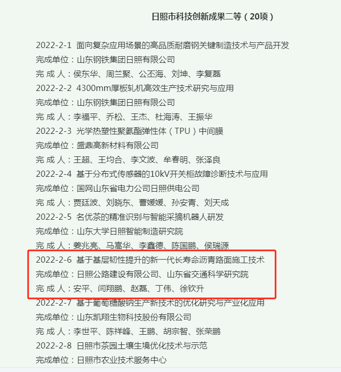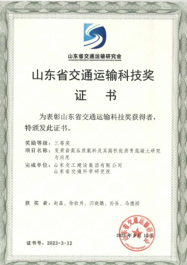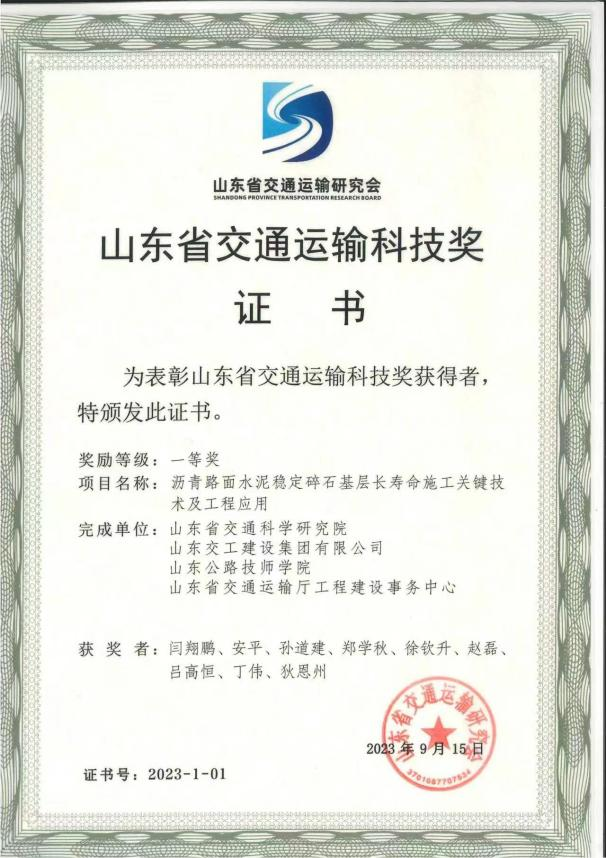 近日,集團一批科技創(chuàng)新實用成果、開發(fā)項目、QC成果斬獲多項榮譽。山東交工建設(shè)集團《瀝青路面水泥穩(wěn)定碎石基層長壽命施工關(guān)鍵技術(shù)及工程應(yīng)用》榮獲2023年度“山東省交通運輸科技獎”一等獎,《變質(zhì)巖高品質(zhì)集料及其高性能瀝青混凝土研究與應(yīng)用》榮獲2023年度“山東省交通運輸科技獎”三等獎,《基于基層韌性提升的新一代長壽命瀝青路面施工技術(shù)》榮獲2022年度“日照市科技創(chuàng)新成果名單”二等獎,《提升聲屏障吸聲板安裝施工效率》《利用PLC模組控制系統(tǒng)有效降低粉罐頂溢料概率》兩項QC成果獲全省交通行業(yè)優(yōu)秀質(zhì)量管理小組二等獎,《水泥穩(wěn)定碎石側(cè)向供料雙層連鋪施工工藝研究》等三項QC成果獲全省交通行業(yè)優(yōu)秀質(zhì)量管理小組三等獎。山東藍能智能科技有限公司的《城市級智慧停車平臺建設(shè)開發(fā)項目》成功入選“2023年度省住房城鄉(xiāng)建設(shè)科技計劃項目”名單。