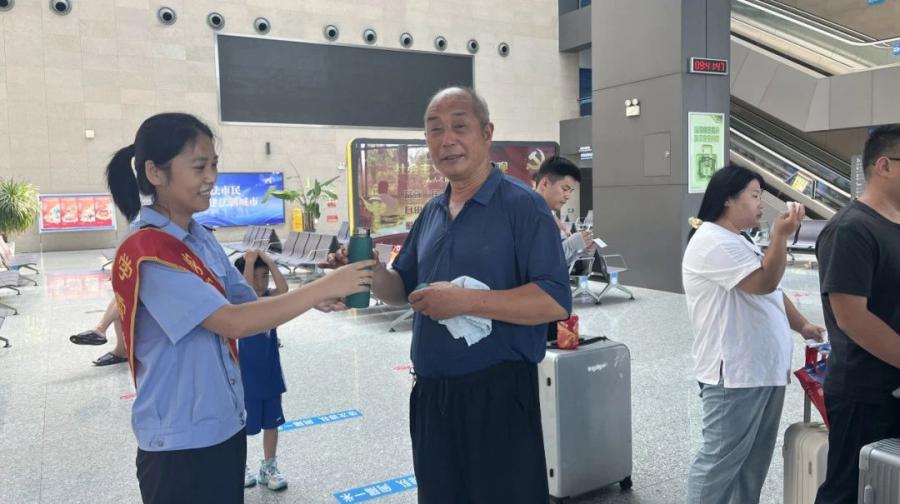 車站工作人員加強對售票處、候車廳等區(qū)域的衛(wèi)生清理、通風和降溫工作,主動為旅客提供問詢解答、提拿行李等服務(wù),為旅客提供一個既干凈又整潔、既溫馨又舒適的出行環(huán)境。