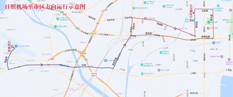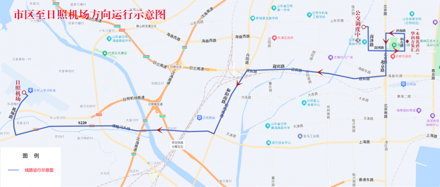 2.日照機(jī)場至市區(qū)方向:由日照機(jī)場始發(fā),經(jīng)S220、和陽南路至市區(qū)。
