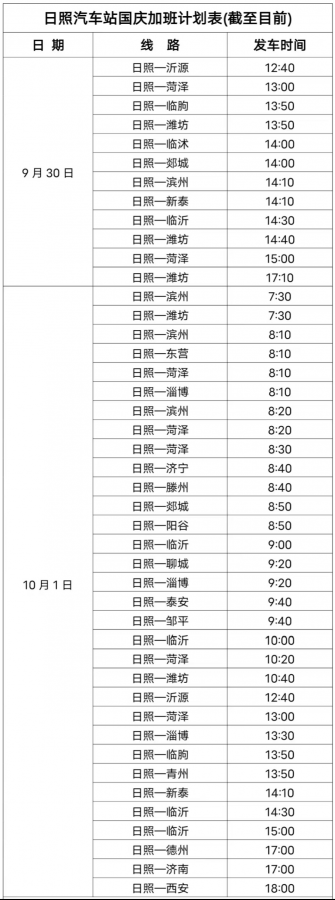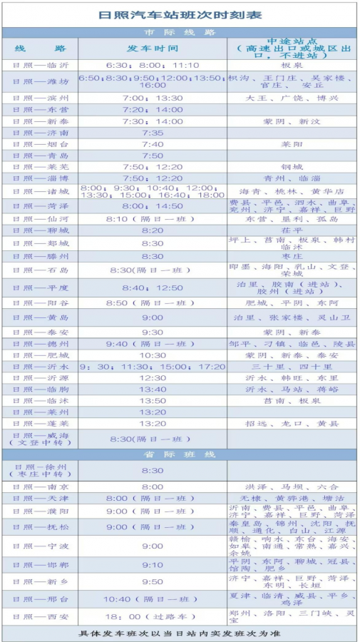加班班次正在持續(xù)更新中,具體發(fā)車班次以當(dāng)日站內(nèi)實(shí)發(fā)班次為準(zhǔn),了解更新、更全的班次信息可咨詢服務(wù)熱線電話:0633—3656666、0633—3657066,聯(lián)系人:司綱濤。