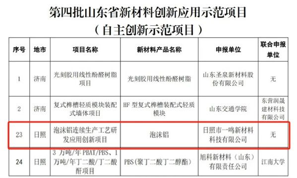 近日,山東省工業(yè)和信息化廳公布第四批山東省新材料創(chuàng)新應用示范項目名單,交控集團參股公司——日照市一鳴新材料科技有限公司“泡沫鋁連續(xù)生產(chǎn)工藝研發(fā)應用創(chuàng)新項目”成功入選。