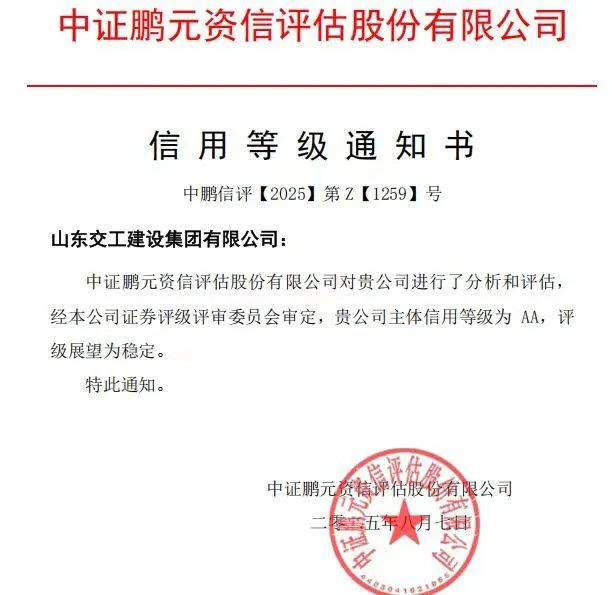 近日,山東交建集團(tuán)完成主體信用等級(jí)復(fù)評(píng),經(jīng)國(guó)內(nèi)權(quán)威信用評(píng)級(jí)機(jī)構(gòu)——中證鵬元資信評(píng)估有限公司綜合分析和評(píng)估,維持公司“AA”主體信用等級(jí),評(píng)級(jí)展望為“穩(wěn)定”。