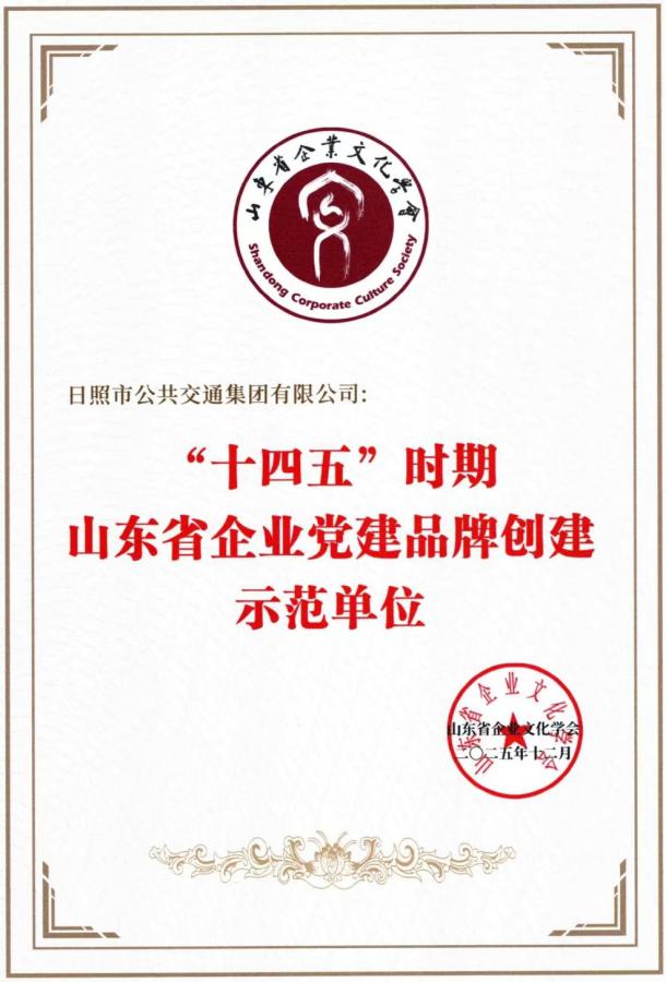 日照市公共交通集團(tuán)有限公司榮獲山東省企業(yè)文化學(xué)會“十四五”時(shí)期山東省企業(yè)黨建品牌創(chuàng)建示范單位
